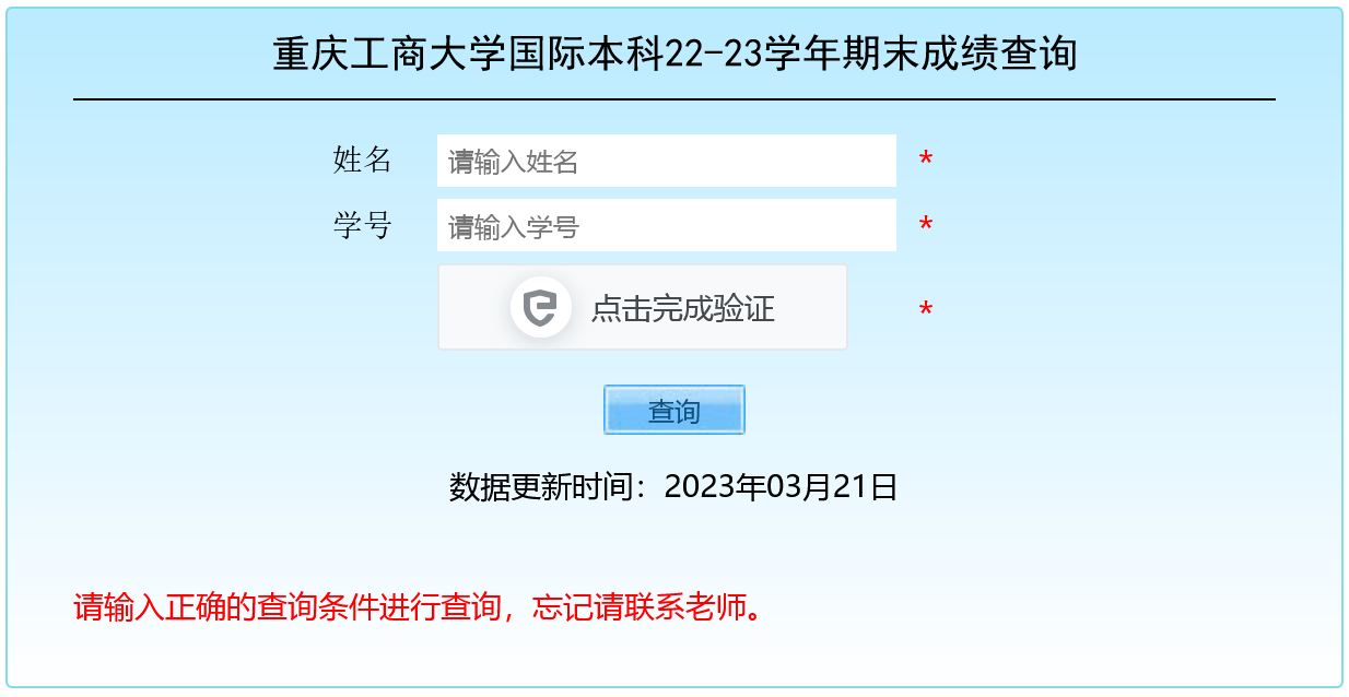 期末考试成绩查询,考生可于3月21日起登录重庆工商大学成绩查询系统官网查询,期末考试成绩查询方式如下:
