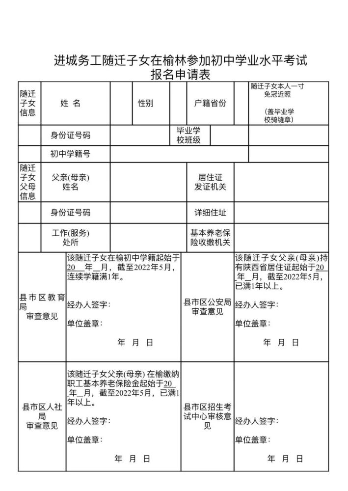 2022年进城务工随迁子女在榆林参加初中学业水平考试报名申请表