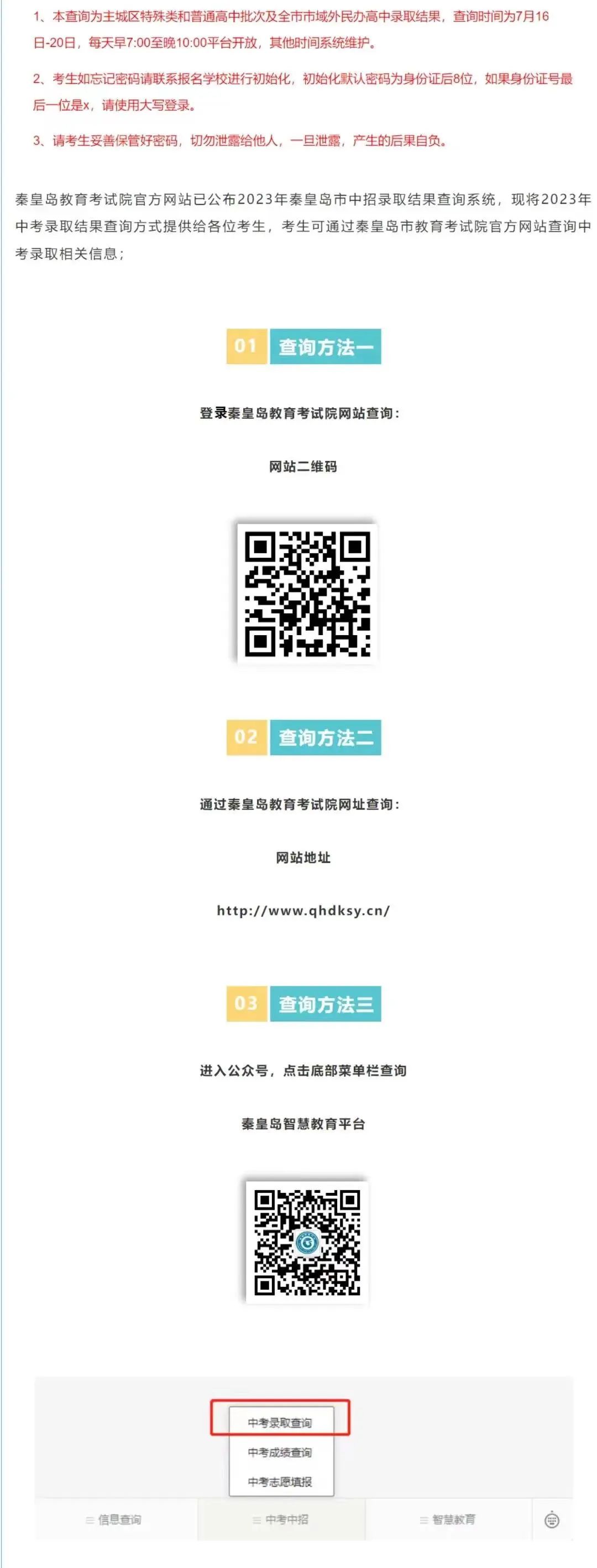 2023秦皇岛市中考成绩查询https://zkzy.qhdksy.cn/cjgl/kscjcx.html秦皇岛教育考试院官方网站公布2023年秦皇岛市中招录取结果查询系统。可查询主城区特殊类和普通高中批次及全市市域外民办高中录取结果。查询时间为7月16日-20日,每天早7:00至晚10:00。